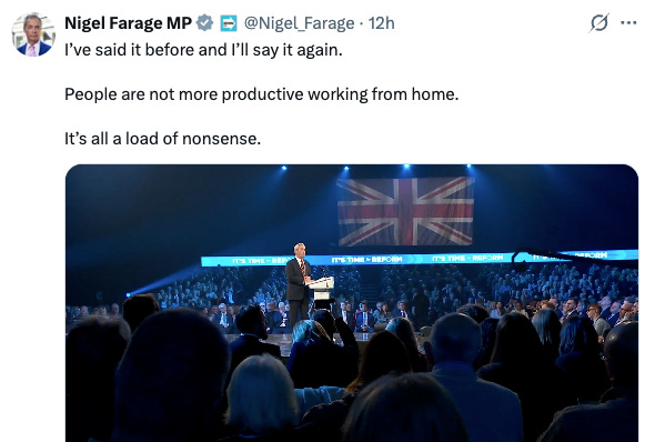 Nigel Farage, Reform Party leader, recently pushed a segment from a speech to the party faithful,where he lambasts the ideas of ‘work-life balance’ and home working. This opposition to working from home, expressed by Farage, is copied and pasted from Peter Thiel's playbook. Thiel strongly opposes remote work, arguing it is ineffective, reduces productivity, and creates a culture where employees "insist on not working". Farage is a die-stamped Thiel Technocrat.